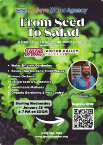 Join us for our 12-week From Seed To Salad Class FREE online course! This workshop is made possible through a partnership with Victor Valley College and will be hosted by Professor Carlos Ruiz! The first class begins on January 28th!